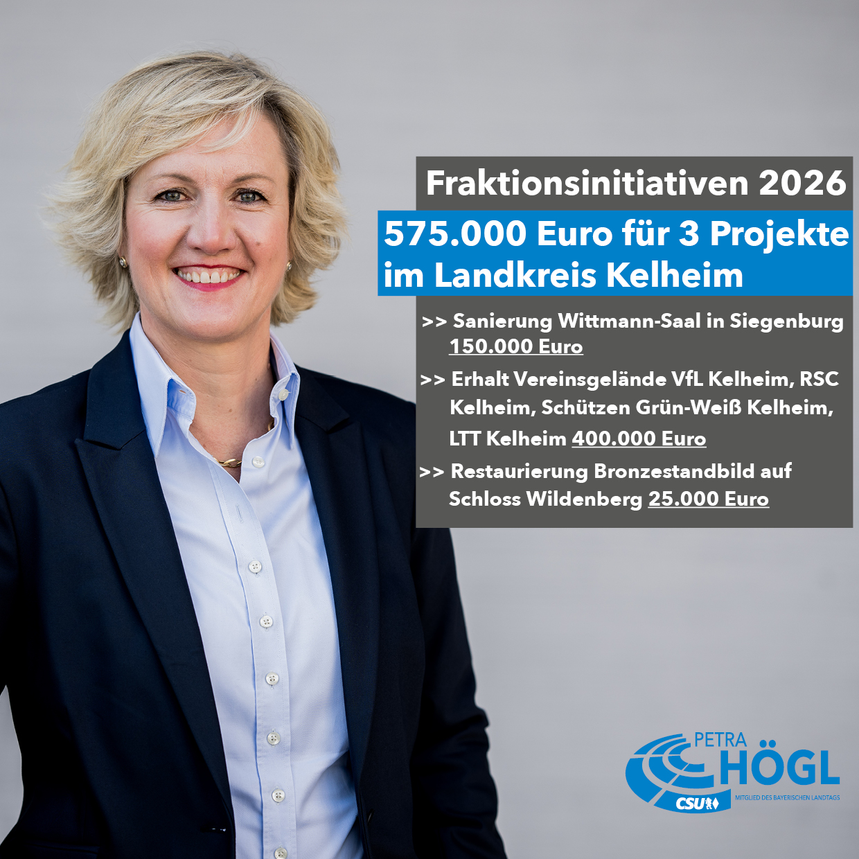 Insgesamt dürfen sich rund 600 Projekte in ganz Bayern über Zuschüsse freuen. Högl betont: „Vom Nachwuchssport über innovative Medizinprojekte bis hin zur Unterstützung einer lebendigen Erinnerungskultur – wir investieren in das, was Bayern stark macht: Menschen, Engagement und Zusammenhalt.“ Besonders im Fokus stehen dabei auch Maßnahmen zur Stärkung der Inneren Sicherheit sowie zusätzliche Mittel für Bildung, Wissenschaft und Gesundheit. Auch das ehrenamtliche Engagement und der Sport als wichtiger Kitt der Gesellschaft werden unterstützt.