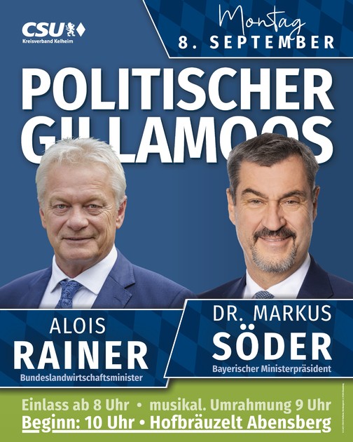 Bereits heute sollten sich alle Fans des politischen Spektakels am Gillamoos die CSU-Kundgebung am 8. September um 10 Uhr im Hofbräu-Zelt fest in ihrem Terminkalender vormerken.