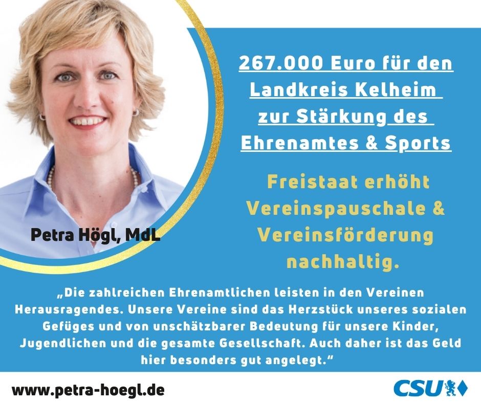 Die Förderung des Ehrenamtes und des Sports ist Kelheims Landtagsabgeordneter Petra Högl (CSU) seit langem ein besonderes Anliegen. „Die nun vom Bayerischen Landtag um 10 Millionen Euro erhöhten Mittel des Freistaats für die Vereinspauschale und Vereinsförderung wirken sich auch vor Ort positiv aus“, berichtet Högl.