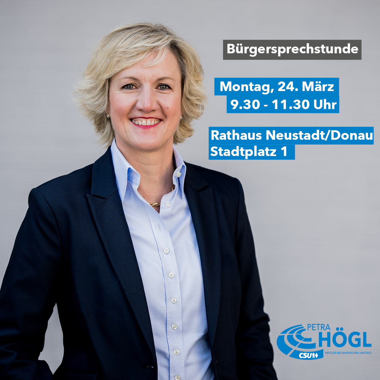 Die Kelheimer Landtagsabgeordnete Petra Högl (CSU) lädt am Montag, den 24. März von 9.30-11.00 Uhr in Neustadt/Donau zu einer Bürgersprechstunde ein. Diese findet im Sitzungssaal des Rathauses (Stadtplatz 1) statt. Interessierte Bürgerinnen und Bürger können ihre Anliegen direkt mit der Landtagsabgeordneten besprechen und ihre Fragen an sie richten. Die Bürgersprechstunde findet regelmäßig einmal pro Monat abwechselnd in einer Kommune des Landkreises Kelheim statt. Eine Anmeldung ist nicht erforderlich. Weitere Informationen gibt es unter 09443/9920730 oder per E-Mail an buero@petra-hoegl.de sowie auf www.petra-hoegl.de.