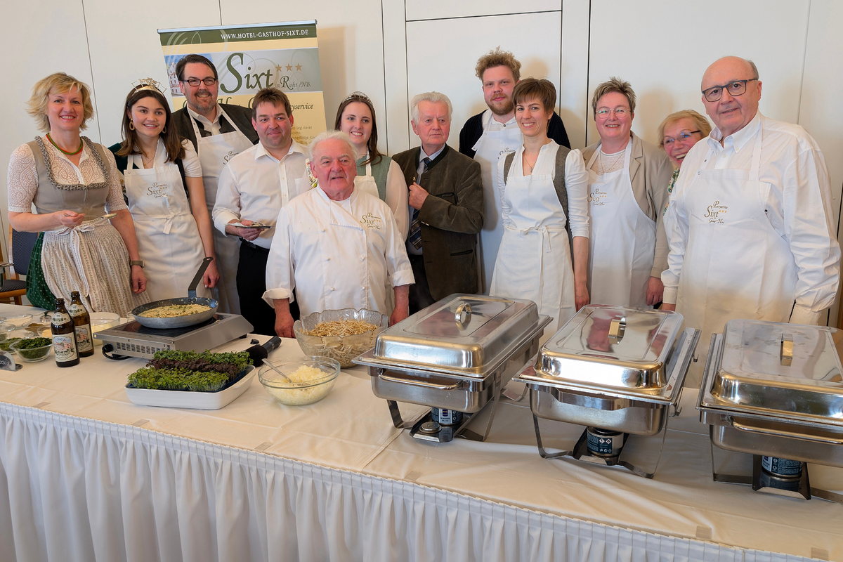 Die bewährte Zusammenarbeit zwischen dem Hopfenbauer Konrad Bogenrieder und dem Gastwirt Jakob Sixt sei auch ein gutes Beispiel, wie frisch und direkt die Ware vom Erzeuger über den Gastwirt auf den Tisch des Verbrauchers komme. Der Hopfenbauer Konrad Bogenrieder ergänzte, dass der Hopfenspargel früher eine „Arme-Leute-Essen“ und heute habe dieses Edelgemüse sogar Eingang bis hinein in die Speisekarten von Schickeria-Lokalen gefunden. Nach den Grußworten banden sich die Ehrengäste die Kochschürzen um und kochten bei einem gemeinsamen Schaukochen unter der praktischen Anleitung von Jakob Sixt IV. und moderiert durch Jakob Sixt III. in einer heißen Pfanne unter Beigabe der Hopfenspargelspitzen, Zwiebeln, Petersilie, Knoblauch, Salz, Pfeffer, Koriander, Sahne und einen Schuß Jakobsbier die ersten Portionen des Edelgemüses in der klassischen Zubereitung.