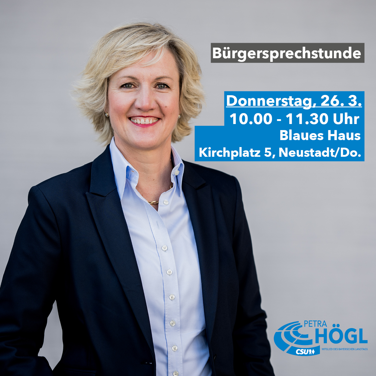 Die Kelheimer Landtagsabgeordnete Petra Högl (CSU) lädt am Donnerstag, den 26. März 2026 von 10.00 Uhr bis 11.30 Uhr in Neustadt/Donau zu einer Bürgersprechstunde ein. Diese findet im Blauen Haus (Kirchplatz 5, 93333 Neustadt/Donau) statt. Interessierte Bürgerinnen und Bürger können ihre Anliegen direkt mit der Landtagsabgeordneten besprechen und ihre Fragen an sie richten. Die Bürgersprechstunde findet regelmäßig einmal pro Monat abwechselnd in einer Kommune des Landkreises Kelheim statt. Eine Anmeldung ist nicht erforderlich. Weitere Informationen gibt es unter 09445-2058463 oder per E-Mail an buero@petra-hoegl.de sowie auf www.petra-hoegl.de.